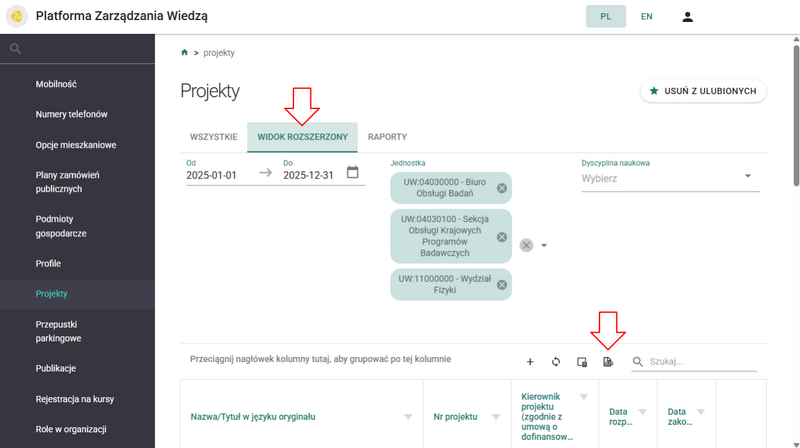 Funkcja eksportu nie jest dostępna w każdym rejestrze i zazwyczaj możliwa jest jedynie z widoku rozszerzonego.