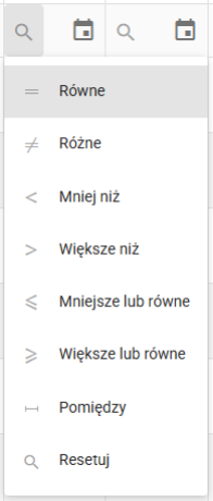 W zależności od typu pola (np. tekstowe, liczbowe, data) można zawęzić zakres wyszukiwania klikając na ikonę znajdującą się z lewej strony pola i wskazując potrzebny wariant dopasowania: